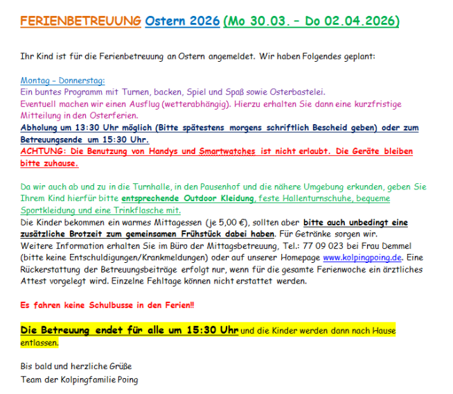 Gilt nur für unsere Mittagsbetreuungskinder und OGTS Kinder aus der Karl-Sittler Grundschule, Bergfeld Grundschule und Anni-Pickert Grundschule, die sich bei uns angemeldet haben!!