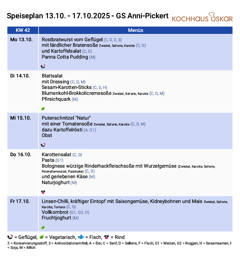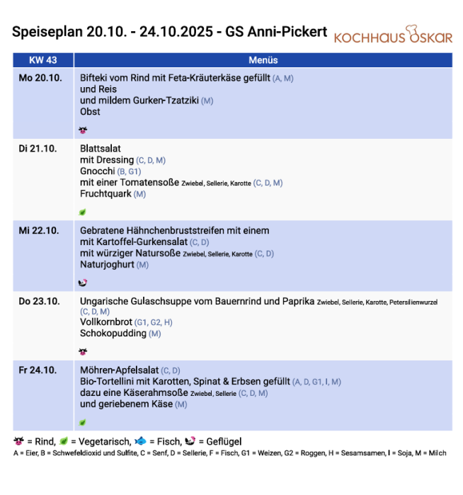In der OGTS Anni-Pickert Grund- und Mittelschule muss an den OGTS Tagen (Montag bis Donnerstag) ein warmes Mittagessen dazu gebucht werden. Dieses wird dann separat berechnet.